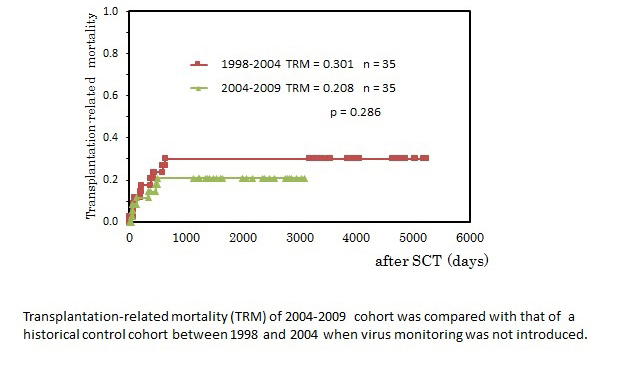Although, the introduction of virus monitoring might not have statistically significant impact of the improvement of TRM, future development of novel anti-virus therapy such as virus-specific adoptive cell therapy and anti-virus medicine will improve the clinical consequences ultimately in combination with early detection of virus infection by sequential virus monitoring. Actually, it has been reported that pre-empiric anti-CD20 administration after early detection of EBV is useful for the prevention of development of EBV-LPD after SCT [29,30].