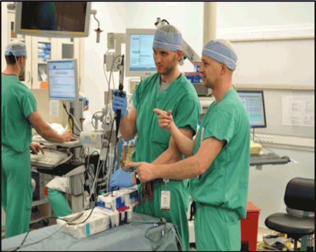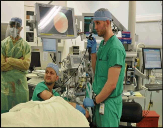 Figure 2. The learner practices with the simulator in the actual operating room where the fiberoptic intubation is to take place.