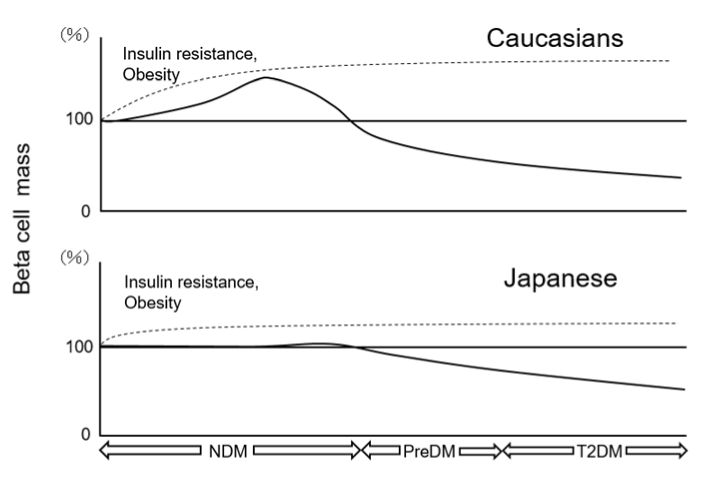 Given the fact that Japanese have even less beta cell functional capacity compared with Caucasians, the importance of treatment as well as prevention strategy for T2DM aiming to preserve or recover functional BCM should be emphasized in the Japanese population. Further studies are needed to determine genetic and environmental factors regulating BCM in humans and clarify the underlying mechanisms of the ethnic difference in β-cell change in response to obesity.