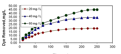 The uptake of Basic Violet 10 from water by activated Ipomoea carnea stem waste carbon increased when the agitation time was varied from 10 to 250 minutes and attained equilibrium at 240 minutes and when the temperature was 30°C , pH 6.5, initial concentration of the basic dye solution used was 20 mg/L and the adsorbent dosage of 50 mg. As the initial dye concentration increases from 20 mg/L to 60 mg/L, the amount of dye removal also increases. The increase in adsorption of basic dye with increase in agitation time may be attributed to the increased intra particle diffusion occurring at long shaking time (Figures 2-4). A similar result was observed by [19] in the removal of chromium using fly ash and bagasse.