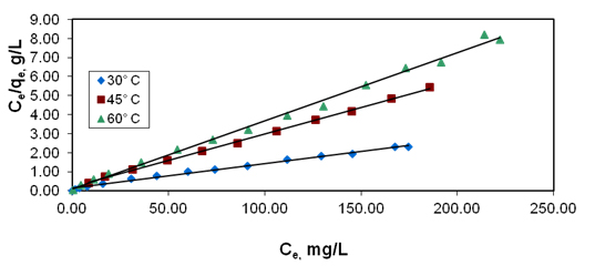 Langmuir isotherm: The study of the Langmuir isotherm is essential in assessing the adsorption efficiency of the adsorbent. This study is also useful in optimizing conditions for effective adsorption. In this respect, the Langmuir isotherm is important, though the restrictions and the limitations of this model have been well recognized [17].