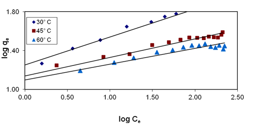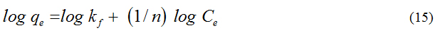The values of n and kf were determined from the plot of log Ce vs log qe where, kf is the indication of the adsorbent capacity and 1/n is a measure of surface heterogeneity, ranging between 0 and 1, becoming more heterogeneous as its value gets closer to zero.