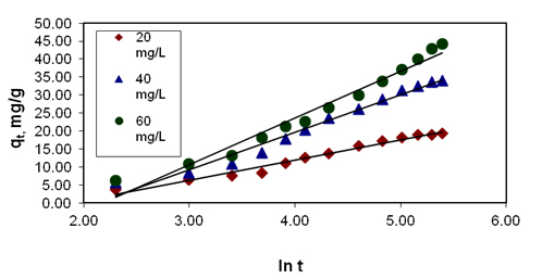 Figure 5. Effect of initial dye concentration on elovich plot