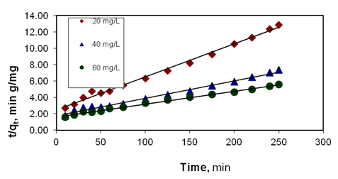 The plot of (t/qt) and t of equation (7) should give a linear relationship from which qe and k2 can be determined from the slope and intercept of the plot, respectively.