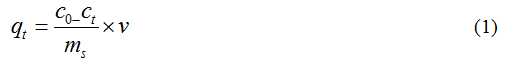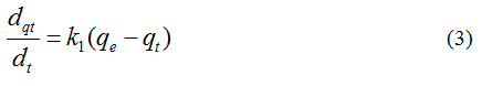 where, qe and qt are the adsorption capacity at equilibrium and at time t, respectively (mg g-1), k1 is the rate constant of pseudo first order adsorption (lmin-1). After integration and applying boundary conditions t =0 to t = t and qt= 0 to qt = qt, the integration form of equation (3) becomes.