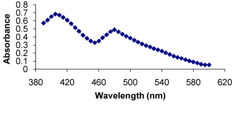 Method I: Novel spectrophotometric methods were developed through derivatization of the secondary amino group of the drug with NBD, which is known to react with primary and secondary amines forming stable condensation colored products. The method I is based on condensation of secondary amine in the RXN with NBD in the presence of alkaline borate buffer (pH 7.8). The colored complex has a characteristic absorption spectrum with a maximum absorption at 405 nm against the reagent blank (Figure 1). The proposed reaction scheme is presented in (Figure 2).