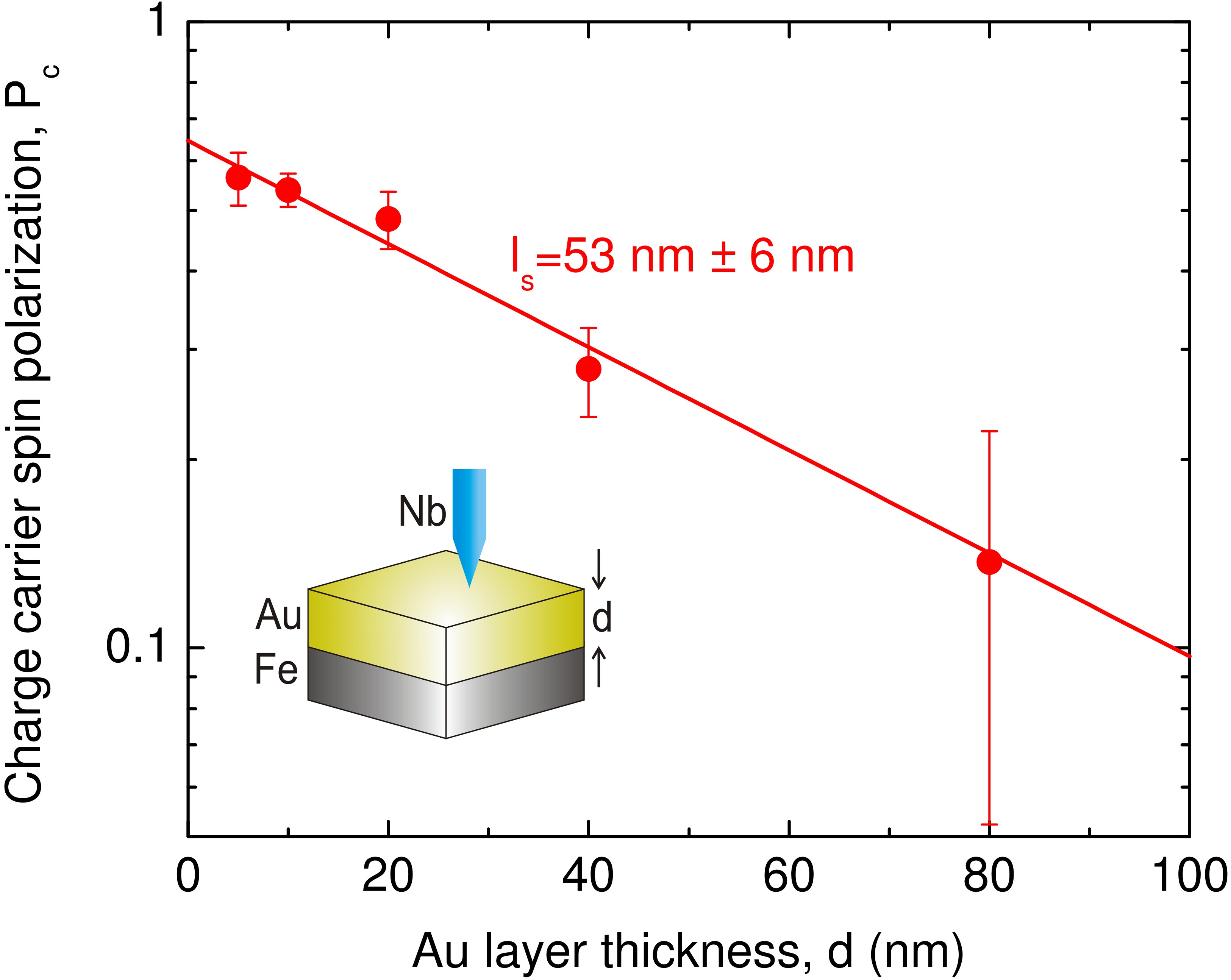 Figure 10. The measurement of spin diffusion length by Andreev spectroscopy. The inset demonstrates the experimental setup: on the top of Fe samples Au capping layers are evaporated with varying thickness. The current spin polarization is measured at the top of the Au layer as a function of the layer thickness. Each point in the figure corresponds to more than 10 independent junctions, which were created by lateral shifting the sample below the lifted Nb-tip by a piezo actuator. The error bars represent the scattering of the calculated polarization values for these independent experiments. The exponential decay of the spin polarization is clearly resolved as the Au layer thickness is increased yielding a spin diffusion length of