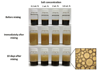 Various reports have revealed variable effects of ionic strength on the stability of Pickering emulsions [4,14]. The variation in emulsion stability was dependent on the nature of the modifier used for coating of the Fe3O4 NPs. For example, Lan et. al [14] reported the change in contact angle and zeta potential of oleic acid bilayer coated Fe3O4 NPs as the ionic strength increased. They further reported the formation of o/w emulsions when [NaCl] <0.2 M and w/o emulsions when [NaCl] >0.2 M. The emulsions were very stable to creaming and show coalescence over a wide range of NaCl concentration (0.10 M <[NaCl] <0.62 M), irrespective of the type of the emulsion. On the other hand, over the range of salt concentration, 0.03 M <[NaCl] <0.1 M and 0.62 M <[NaCl] <2.0 M, the emulsions were stable to coalescence but not creaming. Outside the range of concentrations described above, the emulsions were unstable to coalescence and creaming. The studies also showed that the size of emulsion droplets at pH 10.70 initially decreased before increasing with an increase in ionic strength. In another study, Vengsarkar [4] reported that an ionic strength of 0.1 to 3.5 wt% had no measureable effect on the stability of emulsions stabilized by Fe3O4 NPs coated with stearoyl stearate (Figure 11). Creaming was observed after 10 days in the samples, resulting in a decrease in the volume fraction of the residual emulsion to around 50%. An optical microscopy study of the samples revealed that for samples with an ionic strength > 0.1%, the size of the emulsion droplets increased (> 50 μm) due to coalescence.