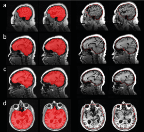 Figure 4: Outliers in the comparison of CNN-TIV (left columns) versus SPM-TIV (right columns) in the reproducibility test set: (a) ADNI subject 002_S_1280 at 1.5T, (b) 052_S_1250 at 1.5 T, (c) 052_S_1250 at 3 T, (d) 133_S_0629 at 1.5T. Displayed images are the TIV segmentations of the first scans in the session, the segmentation results for the second scans were very similar.