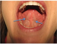 Figure 1. High definition image of the sublingual veins, as indicated by arrows. Midazolam contact is maximized with upright positioning of the patient and avoids inadvertent early swallowing of the medication.