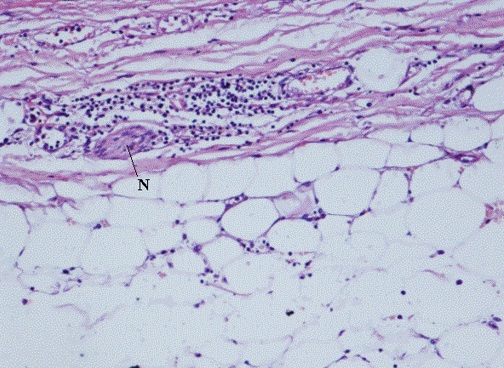 Figure 1. A perivascular lympho-mononuclear infiltration in the epicardial fatty tissue embracing a small nerve (N) (Ematoxylin-Eosin; 200 X original magnification)