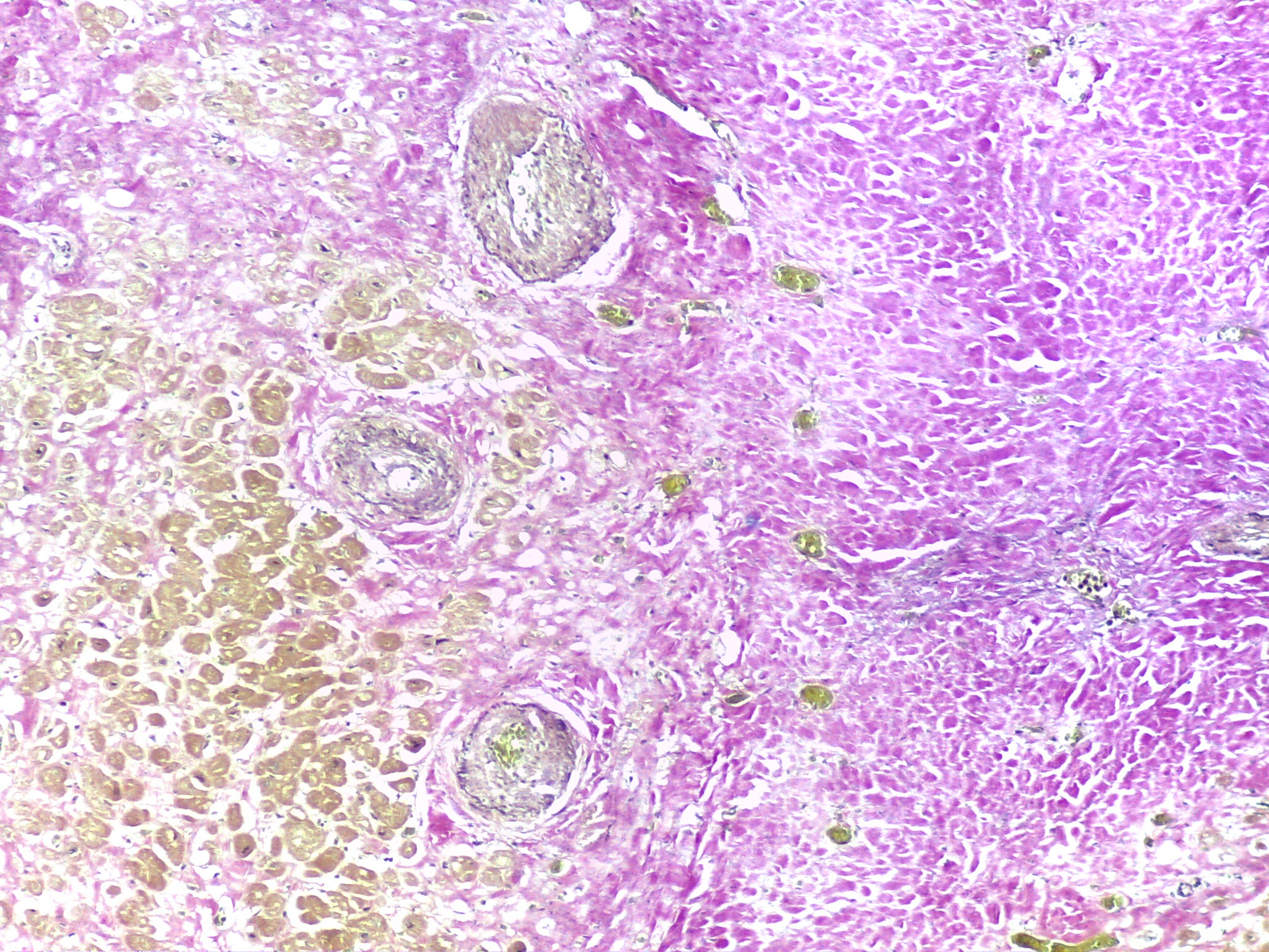 Figure 3. Area with thicken-walled arteries at the interface between the fibrous scar (right) and the adjacent myocardium (left) [EvG x100] (source: INMLCF, I.P.).