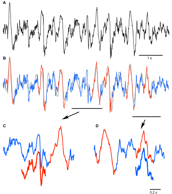 The results of SW detection with neural network on a short segment are shown in Figure 2. The original trace (Figure 2A) was filtered to create the reference time points of all events for their further classification (Figure 2B). The detected SWs are shown in red and detected segments of noise are shown in blue (Figures 2B-2D). It is evident that the applied algorithm yields an excellent quality of detection, however some aspects need to be discussed. Neural network detected as noise (blue) an event that by brief visual inspection could be defined as an SW (Figure 2C, red offset trace). This event was characterized by ample depth-positive smooth half-wave followed by a sharp, depth-negative half-wave accompanied with high frequency activities. Such events are normally considered to be real SW because a ‘smooth’ depth-positive LFP wave is typically associated with hyperpolarization and silence of cortical neurons and depth-negative LFP waves are associated with neuronal depolarization, high-frequency neuronal activities and firing [4,15]. Closer examination however, revealed that the duration of silent phase of the oscillation was well below 100 ms, therefore, the network correctly did not detect this event as an SW if we assume that the typical duration of intracellular silent states during slow-wave activity is longer than 100 ms (see introduction). On the other hand the network detected an event as an SW that might not be one (Figure 2D, blue offset trace). The duration of this event is roughly 200 ms, but it contains high frequency components that are usually not found during ‘true’ silent states. This might be considered as a false positive detection. However, the proposed method enabled 91 ± 5.3% correct classifications for SW (as we mentioned above it was 96.6 ± 1.3 for Noise). Therefore, we conclude that the neural network method can be used to detect semi-automatically SWs if a few percent errors are acceptable.
