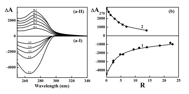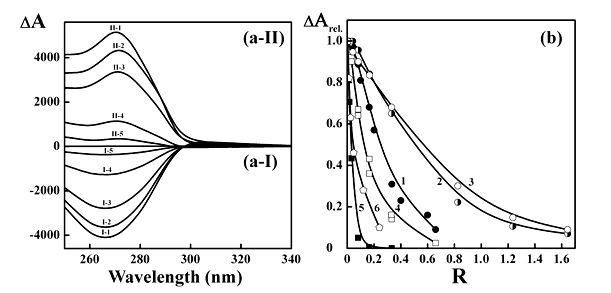 Figure 2b shows that in both cases the amplitudes of abnormal bands in the CD spectra drop. Hence, the decrease in the amplitudes of abnormal bands in the CD spectra (curves I-2 - I-5 and II-2 – II-5) does not depend on parameters of the secondary structure of ds NA molecules. The higher the concentration of nano-Au in solution, the greater is decrease in abnormal band in CD spectra of CLCDs of both types of NAs.