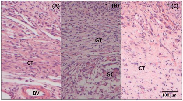 After 7 days post-surgery (Figure 4A), in the adjacent region to the BC, there is an intense inflammatory infiltrate (*), where polymorphonuclear cells and mononuclear cells are observed. Underlying the area of inflammatory infiltrate, a connective tissue (CT) ranging from loose to dense can be observed. After 15 days (Figure 4B), a decrease in the inflammatory infiltrate (*) to moderate is noticed. It is also noticed a disorganized loose and vascularized connective tissue. In this image, a giant cell (GC) is showed, but they are rare, in general. After 60 days (Figure 4C), there is still the presence of a mild infiltrate (*), predominantly of mononuclear inflammatory cells. Permeating this area, there is a loose and connective tissue in organization process (CT), highly vascularized, with several fibroblasts between the lymphocytes and macrophages.