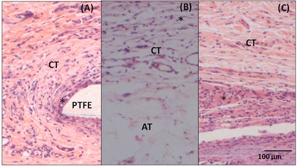 Figure 6. Photomicrography of adjacent tissue to PTFE (A) 7- day post- surgery, showing loose connective tissue (CT) and inflammatory infiltrate(*) in the interface with the material (B) 15- day post-surgery, showing loose connective tissue (CT) and adipose tissue (AT) and (C) 60-day post-surgery, showing dense connective tissue (CT) with inflammatory cells (*). Hematoxylin and Eosin staining, 20X magnification.
