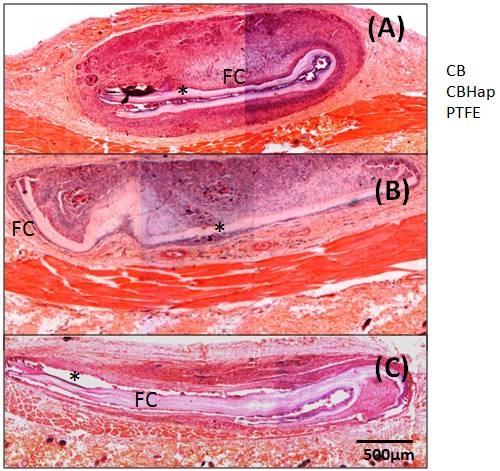 Figure 7. Photomicrography of materials and tissue adjacent to them 60 days post-surgery, showing Fibrous Capsule (FC) around all materials. (A) BC, (B) BC/Hap, (C) PTFE.
