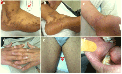 Figure 1. Skin and oral mucosa findings of the first patient (a,b,c,d,e,f).