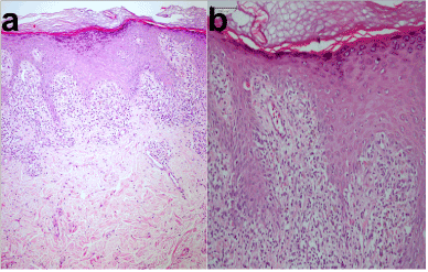 A 15-year old boy was brought to our outpatient clinic because of his generalized and pruritic mucocutaneous eruption. The boy stated that he was inhaling liquid glue (®Bally) from a bag every 2-3 days and an acute eruption began after the 5th inhalation 1 month before. 6 hours after the last inhalation, firstly his lips became swollen, then he felt numb and extremely itchy, and finally vomitted. He also mentioned hallucinating. His parents brought him to the emergency service room at our hospital. The physical examination findings were hypotension, hypothermia, tachycardia, arrhythmia. In the dermatological examination, there was redness in both conjunctiva and an angioedematous swelling and bruising on his lips, palmar and plantar areas, and genitalia. In the full blood count, there were a slight leukopenia (3.2*103 mm3) and moderate eosinophilia (2.7*103 mm3). C reactive protein (CRP) level was 24 mg/L. The levels of IgE and the other immunoglobulins within the normal limits while anti-nuclear, anti-ds and anti-SS DNA antibodies were negative. No other pathology was detected. Within a five day period after the first intervention, the findings of the patient were completely resolved with slight hyperpigmentation and desquamation. However, the boy inhaled the same substance again three days before. Thereafter, an eruptive mucocutaneous rash began from his lips and palms insidiously, and spread to the whole body gradually. The patient was brought to our outpatient clinic. The physical examination of the patient was normal. The patient did not have atopic diathesis nor were there any clinical findings. In the dermatological examination, numerous, discrete, ill-defined, purple-colored, smooth and shiny-surfaced, 1mm to 3 mm in sized, polygonal papules on a diffuse livid macular backround were seen on the trunk, extremities and especially back of the fingers. Similar lesions, and a severe desquamation on the palmoplantar areas and genitalia were also found. The lips were edematous, and there were numerous punctate white papules and Wickham lines on the inner surface of the cheeks and lips (Figures 1a-1f). Hairs and nails were protected. Hematological and biochemical investigations, and serum total IgE level were similar to at the previous admission. Histopathology of a purple-colored papule revealed epidermal hyperplasia and acanthosis with wedge-shaped hypergranulosis, and a saw-toothed appearance of the undersurface of the epidermis in which there were necrotic eosinophilic keratinocytes and vacuolar alteration in the basal layer. In the upper dermis there was a dense, band-like lymphocytic infiltrate (Figure 2a). With the findings, the patient was diagnosed with LP. The patient was treated with one dose of intramuscular systemic steroid (Betametazon dipropiyonat plus betametazon sodyum fosfat), topical corticosteroid (flucticasone fluroate cream 0.05%) and an oral antihistamine (levocetirizine dihydrochloride). The exanthem was completely resolved in a three week follow up period. The patient was offered a challenge test with a patch test allergen which includes TDI (toluene diisocyanate), but his parents did not give consent.