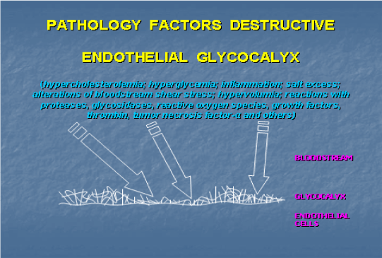 Glycocalyx destruction is an initial event in the vascular lesion development caused by pathological factors. It is an essential initial stage in diabetes mellitus-related micrangiopathies and chronic venous diseases [17]. Ishemia/reperfusion, infection, diabetes and renal failure induce glycocalyx destruction [18-20]. A decrease in its volume occurring in hyperglycemia increases vulnerability of blood vessels and is associated with endothelial dysfunction (elevation of plasma hyaluronan) and coagulation activation in vivo (high blood contents of 1+2 prothrombin fragment and D-dimer of fibrin) [21]. Various pathological factors (hypercholesterolemia, inflammation, hyperglycemia, excess of salts in the body, shear stress, nephrotic syndrome, etc) destroy glycocalyx [22-24]. It was suggested that glycocalyx destruction detected as changes in its composition and a decrease in its thickness has an important role in the development of endothelial dysfunction [22,25] and develops in patients with acute coronary syndrome [26]. The diversity of pathological factors inducing glycocalyx destruction that leads to progression of various diseases implies a common stage in the genesis of circulatory disorders followed by various pathologies.