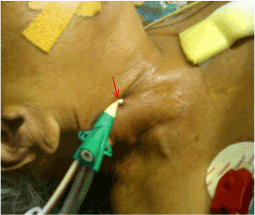 Figure 1. Kinking of advanced venous access (marked by arrow)