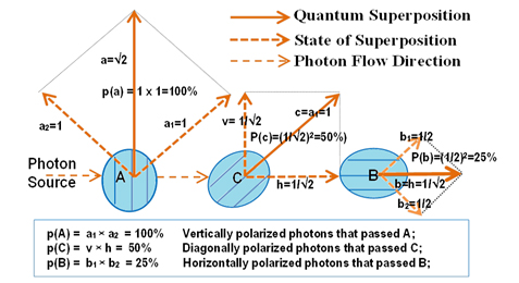 Based on Dirac’s quantum superposition principle (Eq. 1), the probability for a vertically prepared photon to pass C is (1/Ö2)2 = ½ and the probability for a photon prepared by C to pass B is also (1/Ö2)2 = ½ where (1/Ö2)2 is a conversion from complex number coefficient to probability. Thus, the probability for a vertically prepared photon to pass A, B and C by the quantum mechanical interpretation is formulated in Eq. 4(c).