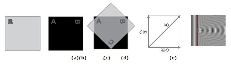 Figure 1. Dirac three polarizer experiment and quantum superposition: (a) Two vertical (or horizontal) polarizers; (b) A vertical polarizer and a horizontal one; (c) A diagonal polarizer inserted between a vertical and a horizontal polarizer; (d) Quantum superposition; (e) Fractal-like photon superposition after a single slit  (http://creativecommons.org/licenses/by/3.0/)