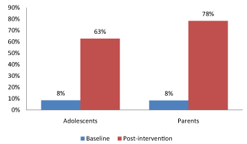 Baseline answers to knowledge items are shown in Table 3. The percent of correct LARC knowledge items (of 8) improved in adolescents (8% to 63%, p<0.001) and parents (8% to 78%, p<0.001) after the intervention (Figure 2).