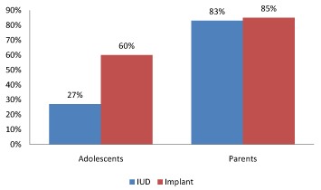 Figure 3. Percent of adolescents and parents with positive attitudes toward the intrauterine device (IUD) and contraceptive implant after an educational intervention (liking the idea of the method for themselves or their daughters).