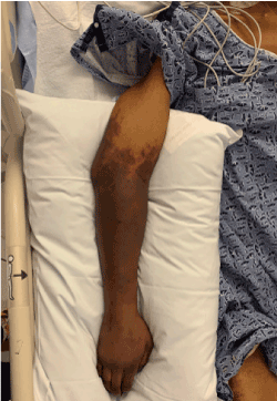Figure 1. Right upper extremity, post-operative day four, visible demarcation of necrotic changes