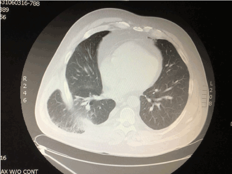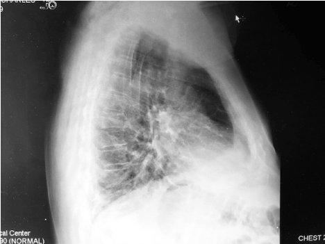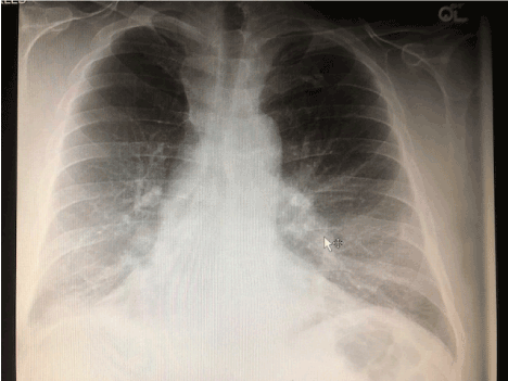 Figure 1A. Admission chest X-ray, PA view showing a vague increased right basilar density thought to be a potential small effusion perhaps related to atelectasis or pneumonia.