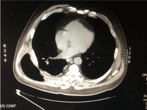 Figure 5. Chest CT, axial view, obtained after surgical repair of chest wall defect