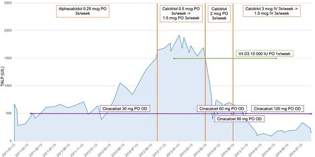 Given ongoing bone pain and now elevated PTH, her treatment was subsequently adjusted with calcitriol given intravenously on dialysis and with progressive increases in the doses of calcitriol and cinacalcet, as can be seen in Figures 1 and 6. She responded adequately to treatment, as evidenced by a decrease in both TALP and PTH, as well as a significant decrease in her bone pain.