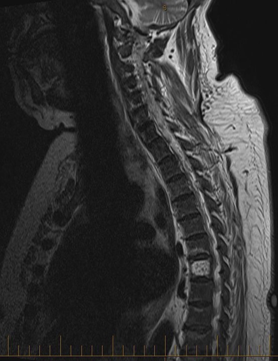 Figure 5: Magnetic resonance imaging of the patient’s spine, showing a brown tumor at D12