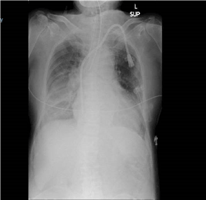 Within 5 minutes of completion of block, the patient experienced sudden onset of shortness of breath hoarseness of voice and anxiety. On examination, she had poor respiratory efforts, bilateral rhonchi with poor air entry and her SpO2 fell to 80% on room air. She was propped up and administered Salbutamol, Ipratropium nebulization followed by IV ketamine 10 mg which gave a transient improvement of her symptoms. However, she still had significantly impaired respiratory efforts with hypoxia and hypercarbia. Trachea was intubated with rapid sequence induction and positive pressure ventilation was initiated. Post intubation chest X-ray showed an underlying right lower zone consolidation with effusion without any pneumothorax or elevation of the right hemi-diaphragm. Surgery was abandoned due the unexpected complication and the patient was moved to post-anesthetic care unit (PACU). After the reversal of muscle blockade, she had low tidal volumes on spontaneous ventilation and was assisted with on pressure support ventilation.