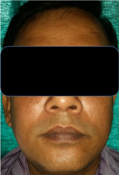 A 45-year-old Indian male patient (Figure 1) was referred to our department with a chief complaint of pain swelling in the anterior mandible for the past 4 weeks. He gave a history of trauma to the chin 2 years back. Intraoral examination revealed obliteration of vestibule from 42 to 45 and swelling in 46 and 47 region (Figure 2). The swelling was soft and tender on palpation. The overlying mucosa was slightly inflamed. No pus discharge or ooze of any kind of fluid was observed. There was no sensory loss. Panoramic radiograph (Figure 3) revealed multilocular radiolucency extending from 42 to 47, with displacement of roots of 43, 42, 41 and resorption of roots irt 43, 44, 45 was observed. A CT scan (Figure 4,5) showed resorption of buccal cortical plate in the posterior mandible. The provisional diagnosis of Ameloblastoma and keratocystic odontogenic tumor were considered. Aspiration yielded a serous brownish red colored fluid. An incisional biopsy revealed nonkeratinized stratified squamous epithelium lining with a flat interface with subsequent stroma. The epithelium shows plaque-like thickenings and whirling pattern of squamous epithelial cells. Other areas of epithelium showed pseudo-glandular pattern with few ciliated and mucus cells. Histopathology (Figure 6,7) was suggestive of glandular odontogenic cyst. Complete enucleation with removal of entire cystic lining and curettage were performed under General Anaesthesia (Figure 8,9). Primary closure was possible. Specimen was sent for histopathology, which again revealed glandular odontogenic cyst. One-year follow-up the case has revealed no recurrence.
