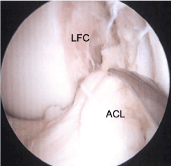 Figure 2. Arthroscopic view from the anterolateral portal viewing into the notch, demonstrating the avulsion of the ACL from the femoral footprint on the lateral femoral condyle. The probe is demonstrating the ligament displacement from its femoral insertion. (ACL = anterior cruciate ligament; LFC = lateral femoral condyle)