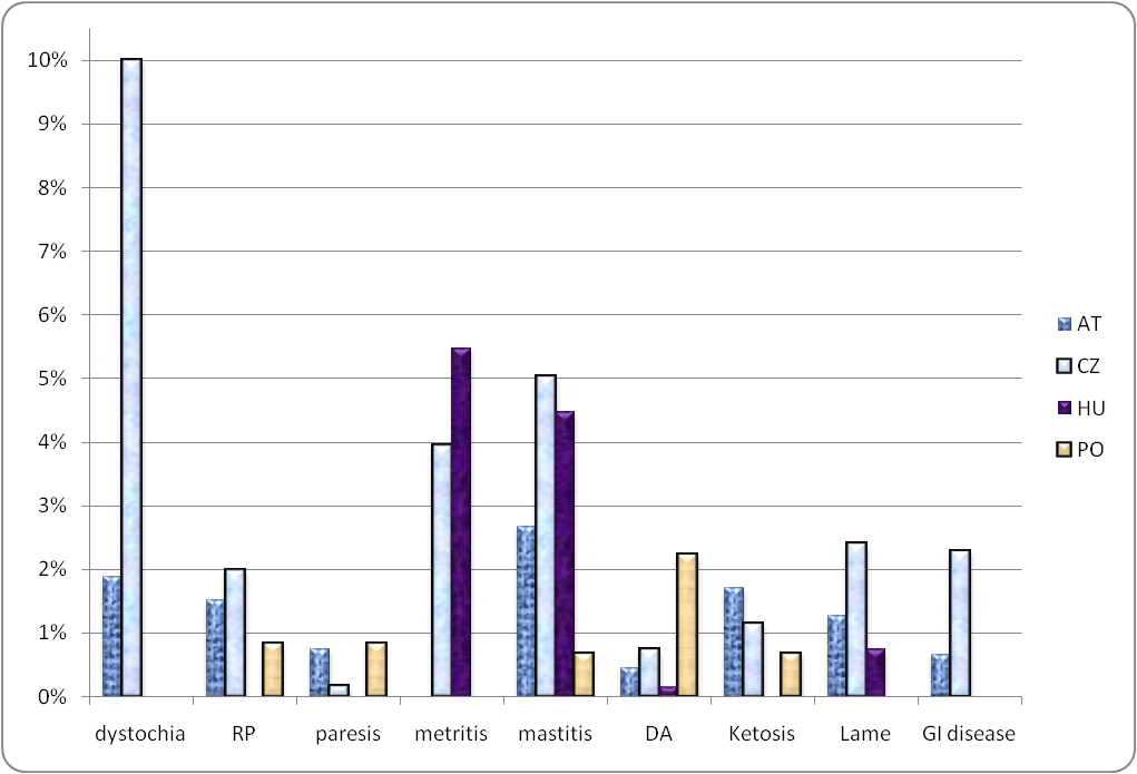 This study followed the same methodology as previously described for western European countries [1]. Fifty-six study herds, in Czech Republic, Poland, Hungary and Austria were enrolled by participating veterinarians between Nov 2013 and Sep 2014. No routine ketosis prevention or treatment was used in the herds. All calving cows in the selected herds were included and enrolled for a period of 1 to 2 months. The Keto-Test strip was used where outcomes were categorized in nominal levels of 0, 50, 100, 200, 500, and 1000 µmol of BHBA/l of milk respectively and 100 µmol/l or higher was defined as SCK. The Keto-Test was used 7-21 days post calving and observations for clinical disease performed by the farm staff 0-35 days post calving. Diagnosis of cow conditions was according to clinical symptoms and definitions that were provided to participating veterinarians and farmers. A logistic regression model with a generalized estimating equation (GEE logistic model) was used to determine herd level factors associated with odds of ketosis while control for clustering of farms within a country. Relationships between ketosis in the study screening (7-21 days post-partum) and clinical disease within 35 days post-partum was analyzed using separate clinical disease specific GEE logistic models controlling for clustering of cows within farms and including significant covariates. For clinical conditions dystocia, twins, RP and milk fever the predictive variable was the clinical condition and the outcome dependent variable was SCK. For metritis, mastitis, clinical ketosis, DA, lameness and GI-disease the predictive variable was SCK at screening and the outcome variable was the clinical condition.