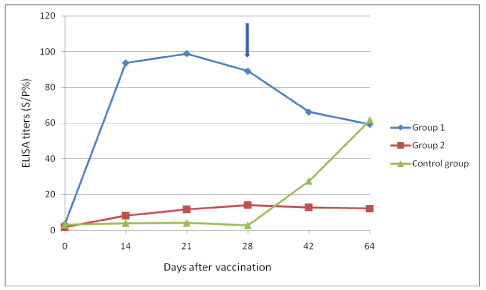 Mean ELISA tests results (S/P%) of the goats in the groups are shown in Figure 1. The inactivated vaccine (group 2) stimulated a strong antibody response reaching a peak on day 21. The titres ranged between 57% and 161% on the same day. However, the attenuated vaccine did not induce any detectable antibody titers.