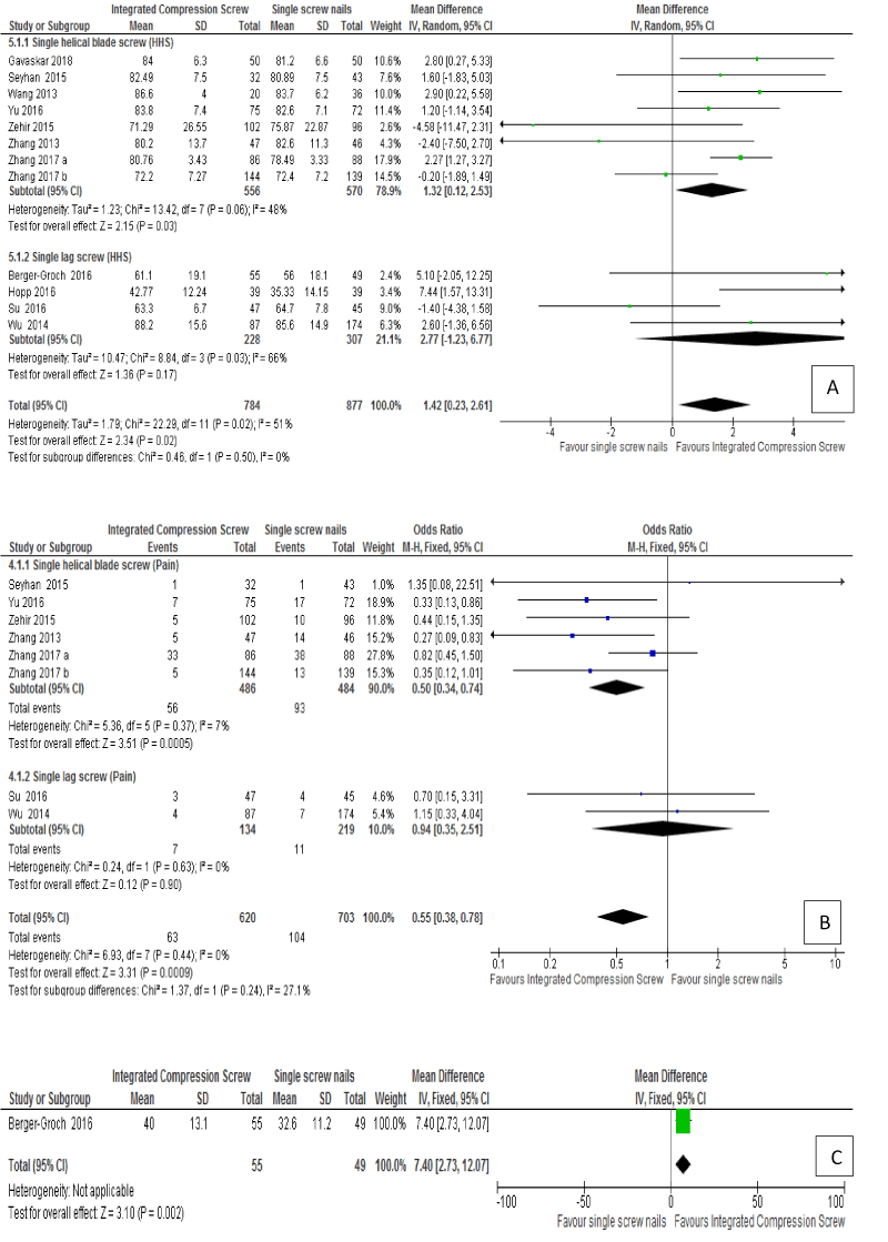 Figure 4. Impact of Integrated compression screw nail compared with single lag screws (a single lag screw or a single helical blade) on (A) Harris Hip Score, (B) Hip and thigh pain and (C) Physical component of the SF-36.