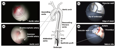 endoscopic visualization, aortic valve motion, large arterial observation, vascular stenosis, grafting, vascular imaging