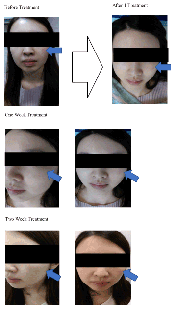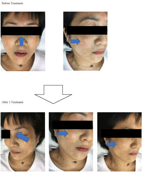 Patients who agreed to receive the treatment have their face cleansed with a hypoallergenic face wash. A small amount of finger- tip size of a serum 0.5 ml N-HA was then applied to each side of the cheek, forehead, chin and the affected areas and gently messaged onto the skin surface by the clinic specialist nurse. After 10 minutes, cotton guaze pads soaked with sterile water was compressed to the treated areas to allow further deliverance of the N-HA to the deeper part of the epidermis. This is repeated for half an hour. The procedure was explained to the patient during the treatment. Post treatment photographs were taken with patient’s consent. The patient was requested to be seen by the dermatologist after the procedure.