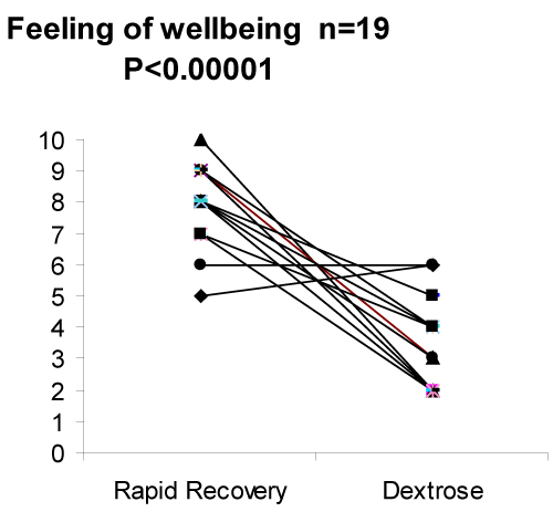 Figure 1. The reported degree of wellbeing on a scale of 0 (terrible) to 10 (excellent) on the two study days was 8.00 ± 0.84 for Rapid Recovery compared to 3.47 ± 1.18 for dextrose (means±sd) (P < 0.00001).