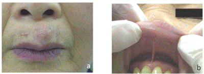 Figure 1. Circumscribing softy mass on the philtrum of upper lip. This asymptomatic mass was covered by normal skin (a) and normal mucosa (b)