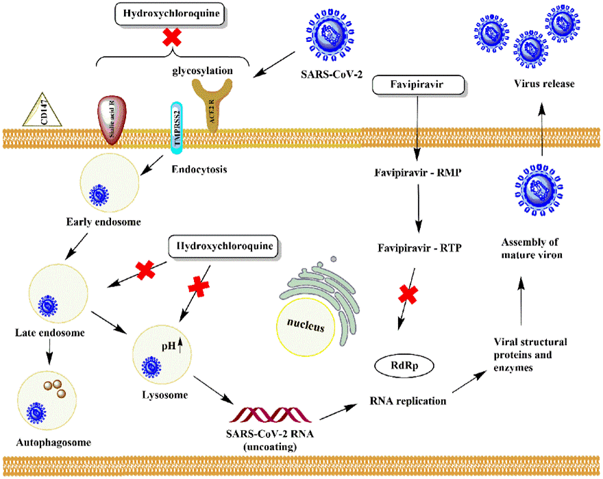 Figure 1. Effects of hydroxychloroquine and favipiravir on viral infection induced by the new SARS-CoV-2. HCQ prevents viral entry by endosomal acidification, glycosylation of receptors and proteolytic processing. Favipiravir acts on RdRp to prevent replication and translation processes