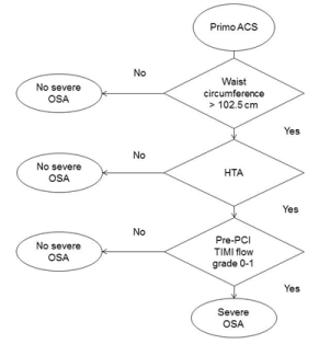 Results:Fifty three patients (60±10 years, 81% men) were included prospectively over the study period. ST elevation myocardial infarction (STEMI) was present in 66% of cases. The primary endpoint was found in 57% of patients. Multivariate analysis identified an occluded infarct-related artery (IRA) and waist perimeter (WP) as predictors of severe OSA (OR, 6.33, 95% CI, 1.48-27.18, p=0.01 and OR, 1.10, 95% CI, 1.02-1.20, p=0.02, respectively). A decision tree was established including a history of hypertension, WP and the presence of an occluded IRA, with a sensitivity of 70%, a specificity of 83%, a positive predictive value of 84% and a predictive negative value of 68%.