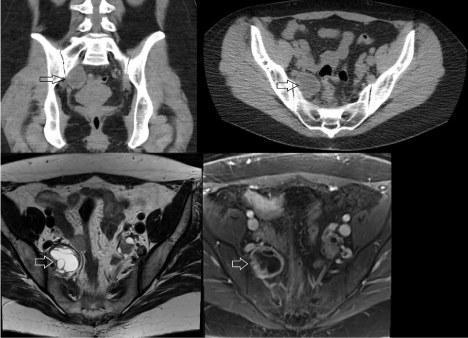 Figure 1. Pre-operative CT (top) and MR (bottom) imaging. Coronal (top left) and axial (top right) CT imaging of the lesion. The lesion, marked with an open arrow, had a hypodense center consistent with a cystic mass. T2 axial (bottom left) and T1 post-contrast (bottom right) MRI demonstrating the multi-loculated structure and contrast-enhancing rim of the lesion.