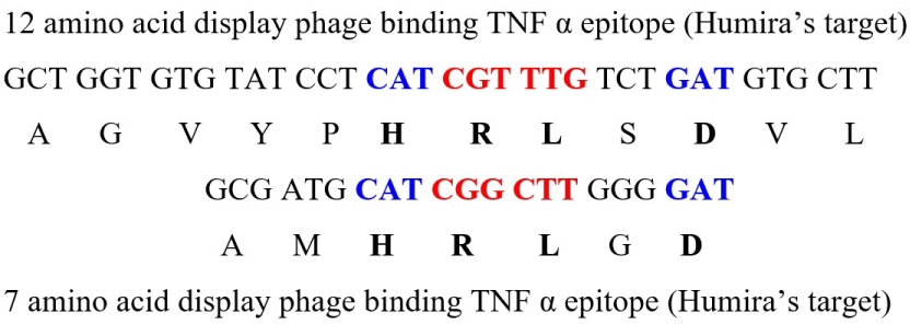 Footnote: This binding sequence HRLxD is a subset of a sequence which binds the human TNF α epitope. This full sequence can replace Humira without the lymphoma side effects of Humira.