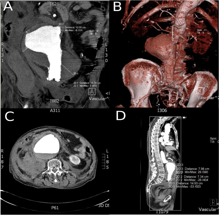 A 78-year old man with a medical history of smoking, hyperlipidemia and hypertension was admitted to our department with ruptured abdominal aortic anerysm (AAA) dignosed by ultrasonography of the abdomen. The blood pressure was 60/20 mm Hg. An emergent computed tomography scan of the abdomen revealed a rupture of a giant infrarenal AAA of 16 cm in diameter with extensive intraluminal thrombus, evidence of rupture and large intraabdominal hematoma (Figure 1). Abdominal computed tomography angiography (CTA) with contrast showed a ruptured giant infrarenal AAA measuring 16x11 cm with a large mural thrombus and intra-abdominal hematoma compressing intra-abdominal organs (Figure 1)