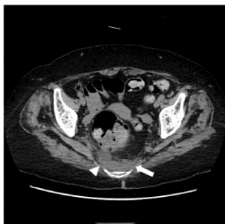 All patients had a fever of 36.9 °C -39.6 °C and no abnormal findings related to fever in the physical examination when they received their CT scan. The patient with a fever of 36.9 °C had an ordinary temperature of 35 °C level before the day when he received a CT scan. Aside from the patient with a fever of 36.9°C, all patients were treated with antipyretics and/or antimicrobials and subsequently returned to normal temperature. Glycerin enema was performed on the day before CT examination in a patient with a rotator cuff tear of the right shoulder joint. None of the patients received any neuroleptic drugs. Aside from the patient with right putaminal hemorrhage and one patient with cerebral infarction, all patients exhibited elevated white blood cell (WBC) counts. Aside from the patient with right putaminal hemorrhage, all patients showed elevated C-reactive protein (CRP; 4.43~16.06 mg/dl) in their blood test. The value of creatine phosphokinase (CPK; 361 IU/L) was slightly elevated in one patient, and the reason for hospitalization was fever. All patients had normal hepatic function aside from the patient with right putaminal hemorrhage, who showed slight hepatic dysfunction with increased aspartate aminotransferase (AST; 63 IU/L) and alanine aminotransferase (ALT; 112 IU/L). Renal function was normal in all patients, aside from the patient with traumatic subarachnoid hemorrhage, who had moderate renal dysfunction with increased blood urea nitrogen (BUN; 43.8 mg/dL) and creatinine (CRE; 2.00 mg/dL). Cardiac function was normal in all patients except for one patient with cerebral infarction who had chronic cardiac dysfunction, and echocardiography revealed diffuse hypokinesis of the left ventricular wall motion and decreased ejection fraction (by MOD: method of disc) of 31.9%. However, the patient with chronic cardiac dysfunction had no pulmonary edema, ascites, or subcutaneous edema. None of the patients exhibited anasarca, pelvic bone fracture, compression gangrene around the sacrum, neoplasm or retroperitoneal fibrosis, or fasciitis. No patient had a history of radiation therapy or surgery in the pelvic region.